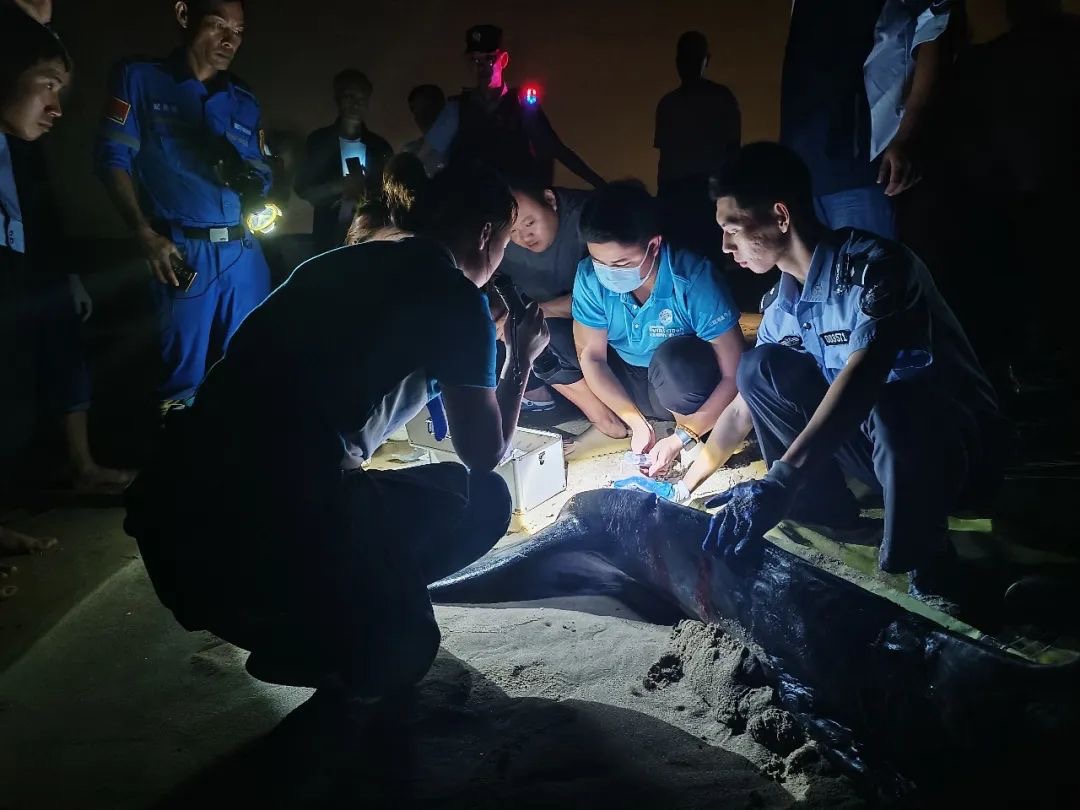 “鲸豚搁浅的时候是非常惊慌的,现场需要把人群疏散,避免鲸豚产生较强的应激反应。”蒲冰梅表示,人群的声音和灯光等,都可能是惊扰鲸豚的因素。她曾救助过两头鲸,就是被现场的人群吓到,因应激反应太强烈死亡。