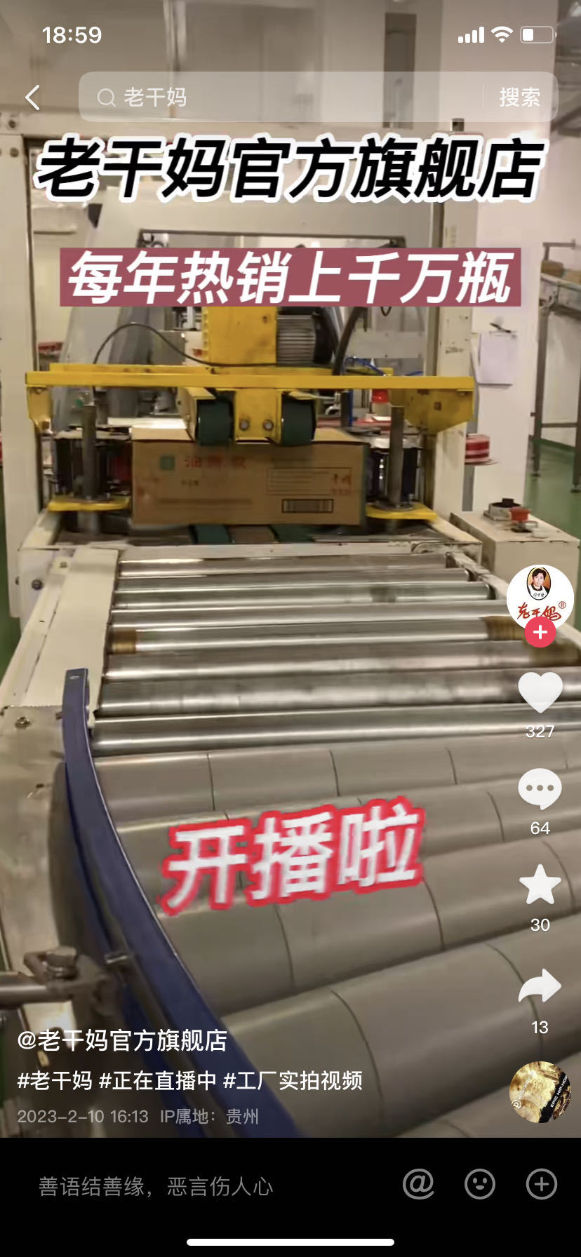 小编注意到,老干妈官方旗舰店抖音账号的第一条视频发布于2020年2月27日,主要内容是老干妈捐赠资金和食物驰援湖北。截至2023年2月18日,该账号的粉丝数为76.9万,一共发布789条抖音,累计获赞119.0万。最新的一条视频于2月10日更新。该视频表示,老干妈官方旗舰店每年热销上千万瓶,开播啦!
