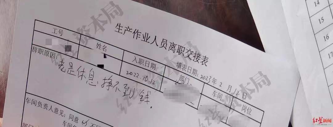 该工人去年10月12日入职,工作到今年2月。她对红星资本局抱怨说,“老让我休息,(年后)我来6天,让我休息2天了。”