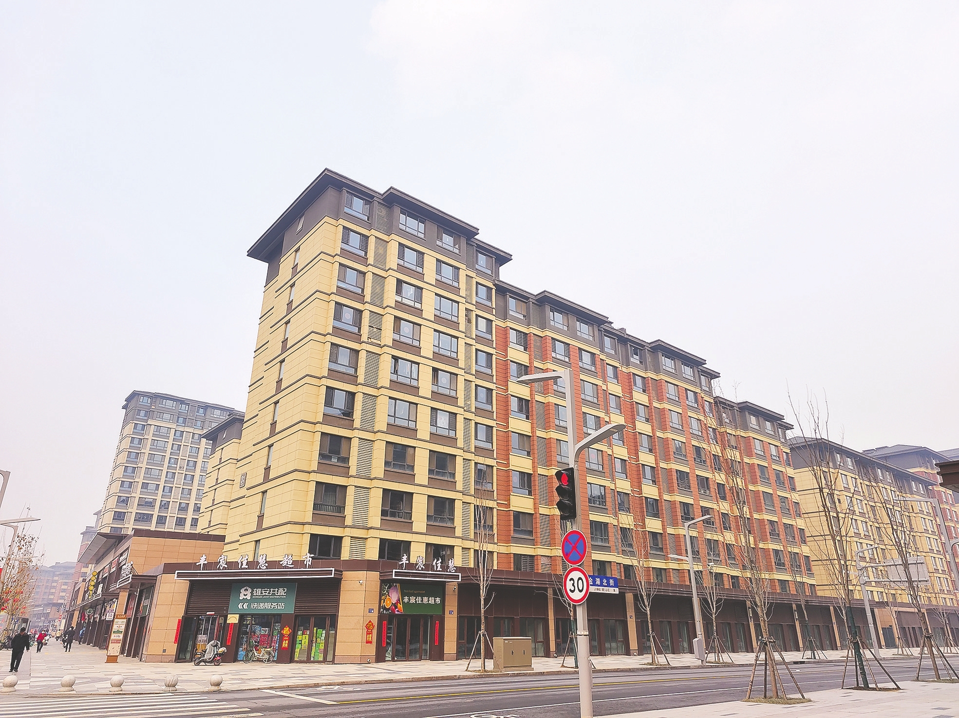 穿行在这片回迁安置房中,可以发现,商业配套已经基本齐全,几步一个生活商超,各式餐厅也很多,外卖小哥们在忙碌地穿梭,路两旁停靠着共享单车,年轻人喜欢的奶茶店也没有缺席。