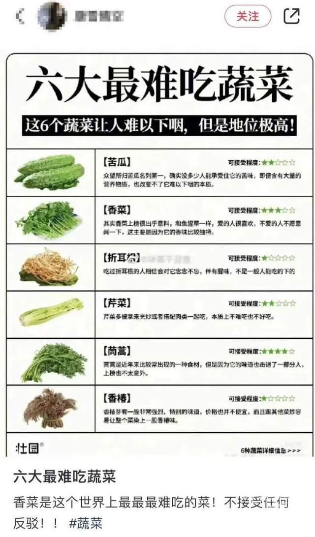 最近网络上流传一张图片,“六大最难吃蔬菜”,说的是这6个蔬菜让人难以下咽,但是地位极高!分别是苦瓜、香菜、折耳根、芹菜、茼蒿和香椿。
