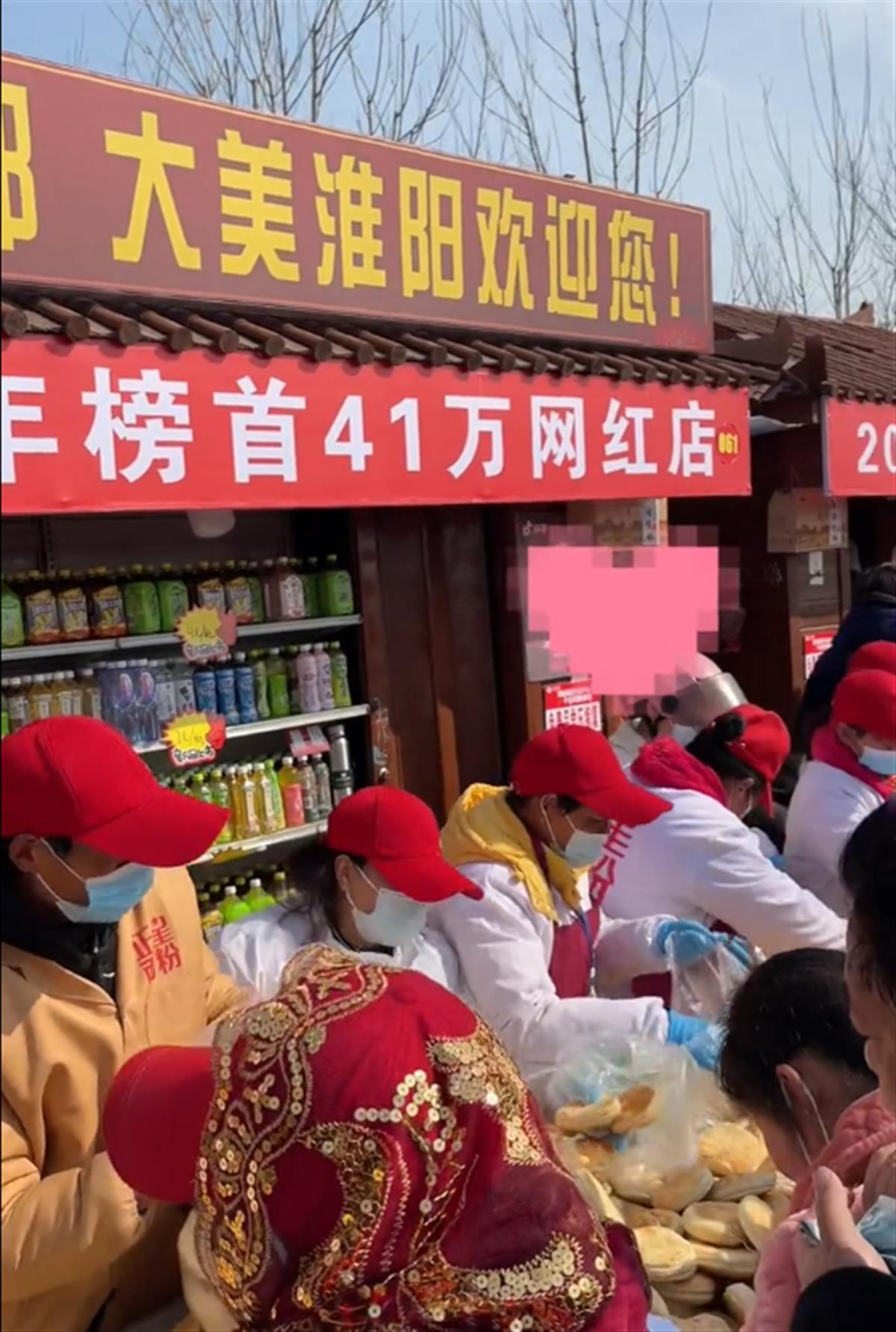 该网友拍摄的视频显示,庙会广场上人山人海,41万网红摊位前围满了游客,一排营业员正忙着给游客往袋子里盛装压缩馍。