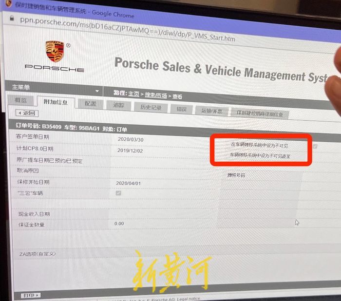 李女士表示,2023年2月17日,她再次到4S店内查看车辆销售系统,发现系统内的发动机类型与交付车辆不一致。交付车型MacanA151发动机型号为DLH083900,系统内购买的车型95BAG1Macan发动机型号为DLHB083900。“4S店工作人员告诉我,他们也不清楚原因,需要上报总部。后来回复说,系统显示的是内部编码,没有问题。”此外,李女士在车辆销售系统内看到,2019年12月27日出现过开具发票的记录,而她的购车发票日期为2020年4月1日。“说明这辆车开过两次发票。”