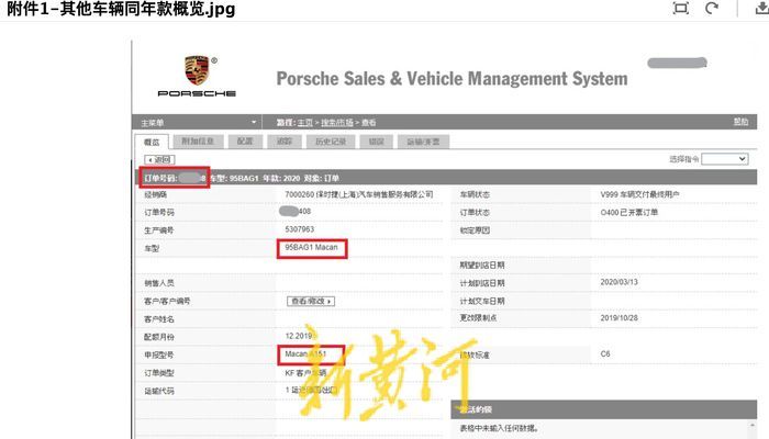 新黄河记者获得的情况说明中,4S店就车辆型号不一致的问题回应称,销售系统内显示的车型代码属于保时捷内部的车型代码;而交付车型代码为中国产品认证的车辆型号名称,两个名称设定思路不同,一个是厂家命名的内部小名,一个是在中国市场对外使用的大名,均为李女士订购的Macan车型。说明中附上其他车辆的同年款系统记录图片,与李女士一样,订单车型为95BAG1Macan,申报车型为MacanA151。4S店认为,由此可证明出现车型两个编号并不冲突,都是指向同一车型的。