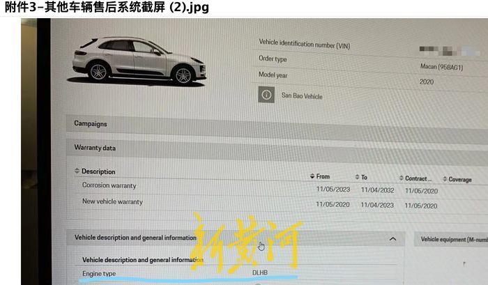 车辆发动机型号不一致的问题,4S店解释称,李女士在系统中看到的发动机类型代码DLHB,是保时捷售后系统内部通用的发动机类型;而交付车辆显示的DLH083900为产品认证的发动机号码,与车辆铭牌、货物进口证明书、购车发票、行驶证等一致。厂方产品认证的发动机号码有相应的命名规则,可能和内部系统有所不同。4S店用附件图片对此说法进行佐证,在同款车的售后系统截屏中,发动机类型代码为DLHB,与李女士在系统内看见的购买车型的发动机类型一致。