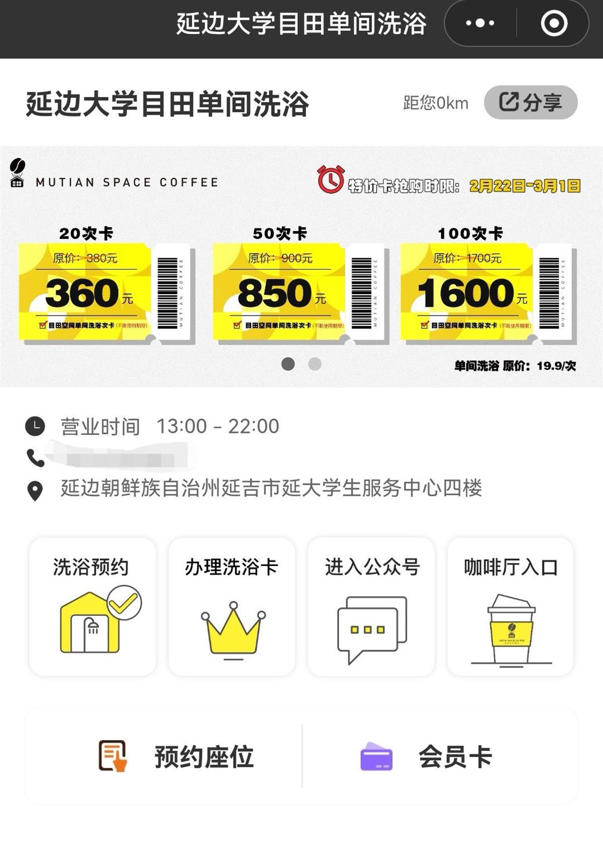 22日晚,极目新闻记者查看该校目田洗浴预约小程序发现,选择位置和时间后,单价为19.9元,同时也有三种洗澡次卡可以购买。