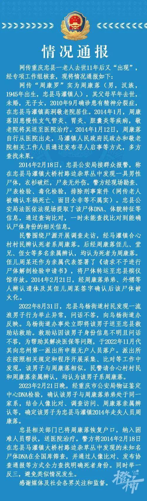 昨天下午,重庆忠县警方发布情况通报,对此前“网传老人被确认车祸死亡11年后‘复活’”一事做出回应。