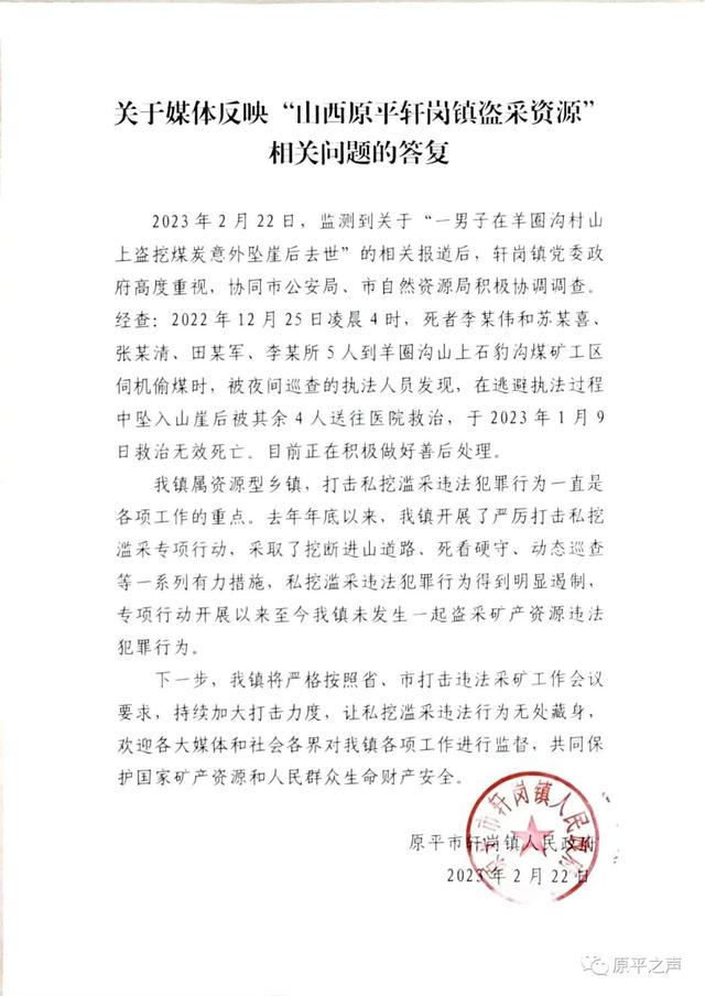 据山西忻州原平市宣传事务中心微信号“原平之声”消息,原平市轩岗镇政府发布《关于媒体反映“山西原平轩岗镇盗采资源”相关问题的答复》称,2月22日,监测到关于“一男子在羊圈沟村山上盗挖煤炭意外坠崖后去世”的相关报道后,轩岗镇党委政府高度重视,协同市公安局、市自然资源局积极协调调查。