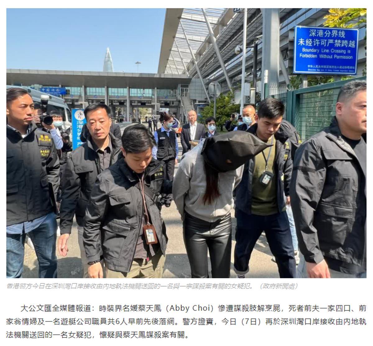据星岛环球网报道,香港名媛蔡天凤被碎尸案又有新进展。3月7日,深圳湾口岸,香港警方接收了由内地执法机关移交香港的一名与碎尸案件有关的29岁女子,继续调查蔡天凤被碎尸案。至此,该案件累计有7人落网。