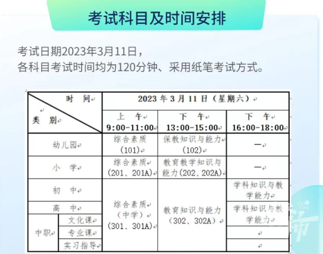 从校门口贴出的考点安排表来看,第一场9:00—11:00,考的是综合素质(中学)。