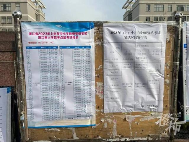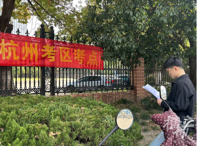 早上8:30,橙柿互动记者来到浙江树人大学考点,校门旁边挂着“全国中小学教师资格考试杭州考区考点”的横幅。横幅下,十几位考生拿着资料,在做最后的复习。