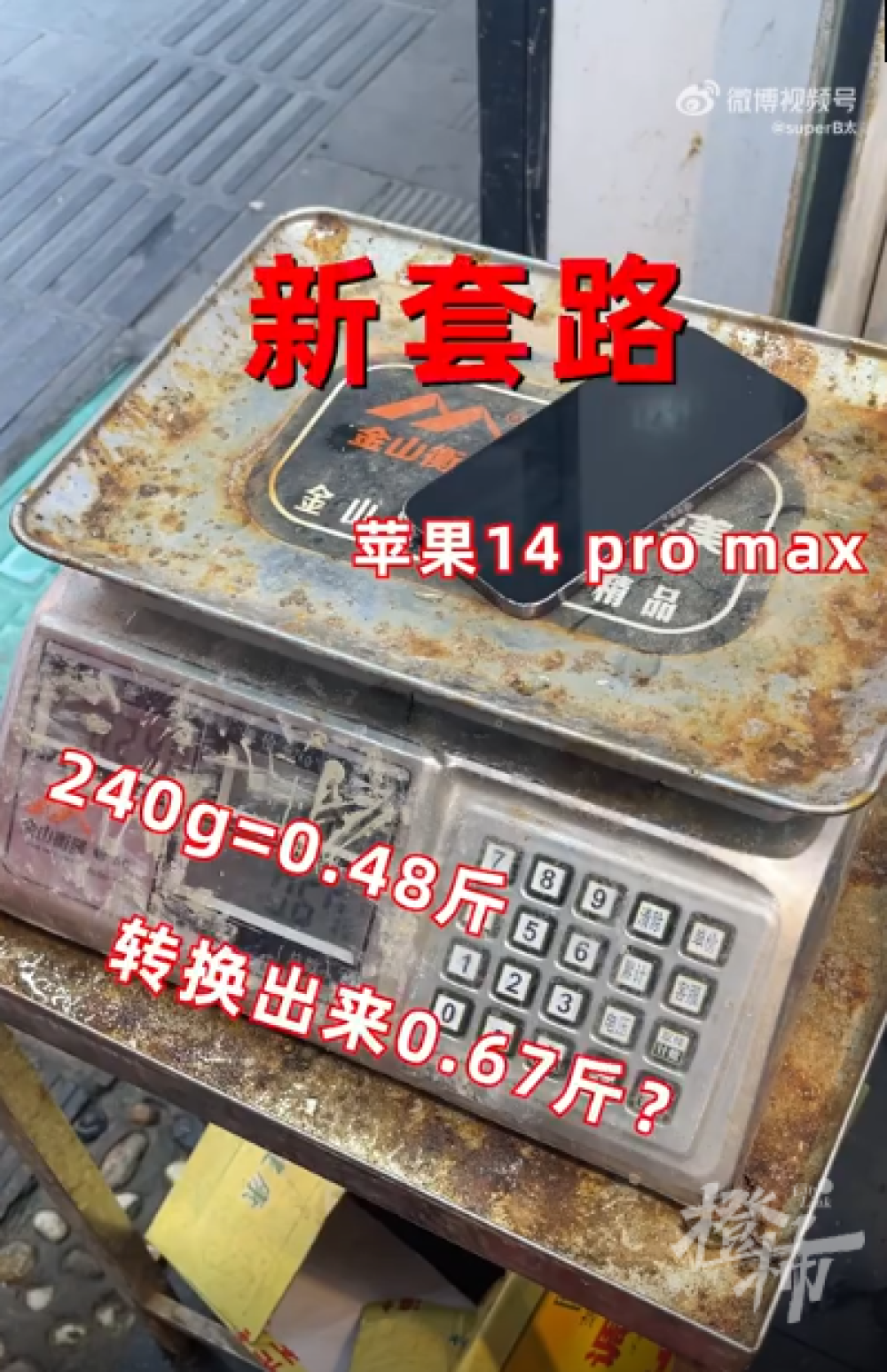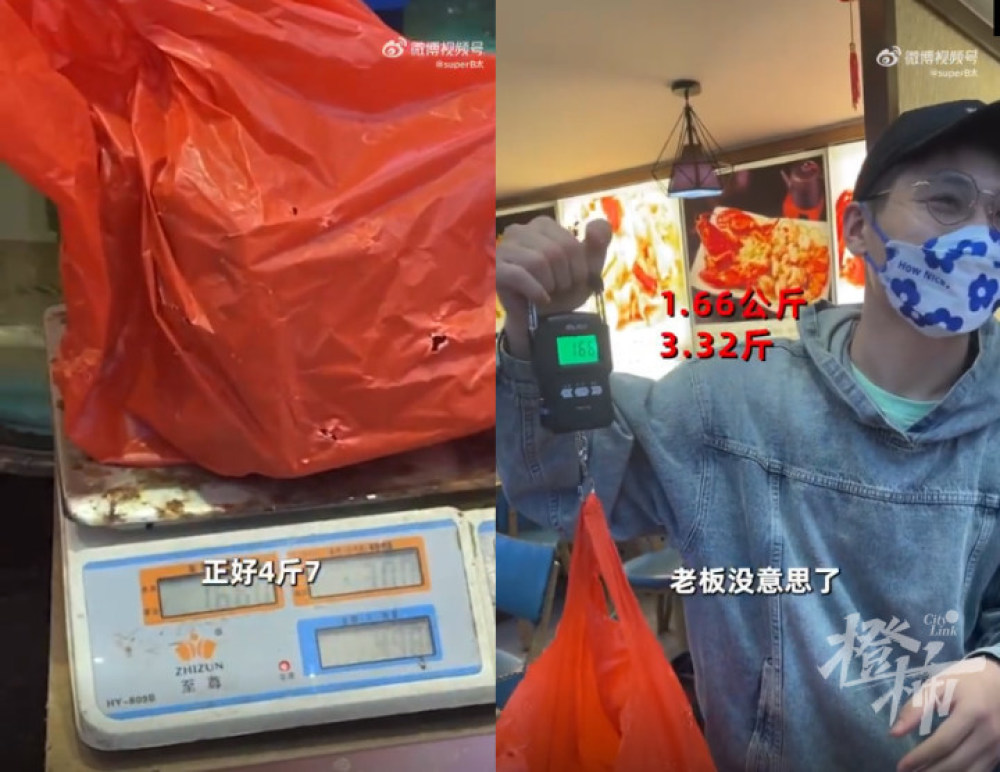 随后,他又换了一家海鲜加工店,店家将帝王蟹放上秤是5.38斤,博主拿出自己的电子秤只有3.92,重量少了1斤,疑似碰到“鬼秤”(指经过非法改装的电子秤,这类电子秤可以根据需要显示虚假物重,通过密码操作又能恢复正常,令工商执法人员无法检查)。