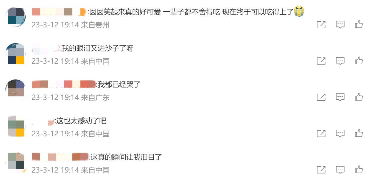 还有网友评论称,“这个场景真的是戳到我的心了!”“奶奶笑起来真的太可爱了,一辈子都舍不得吃,现在终于可以吃上了。”