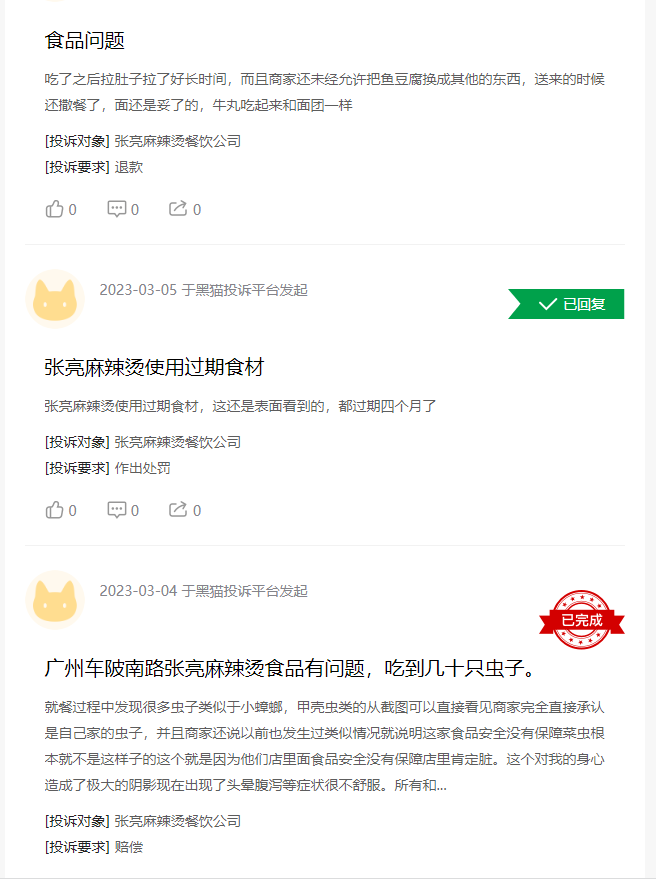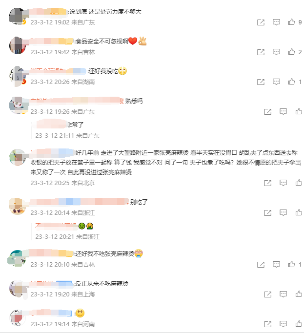 2019年11月,女子吃出蟑螂;2022年8月被曝碗底有污垢,4月执法人员发现过期底料,5月,多店被曝食材不新鲜、后厨卫生不达标、员工健康证过期等问题;今年2月,有顾客吃出未拆封豆腐······作为知名麻辣烫品牌,门店多以加盟为主,面对频发的食品安全问题,张亮麻辣烫对加盟店的监管亟待加强。