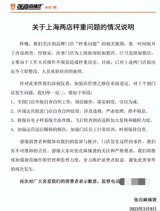 张亮麻辣烫的官微在3月9日发布声明称,涉事门店为上海新南街加盟店、江川北路加盟店,“主要由于工作人员操作不规范造成称重误差,目前已经对上述两门店做出厄令立即整改,人员重新培训的处理。”
