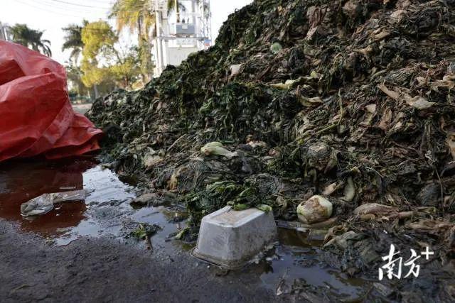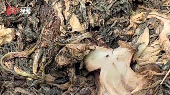 据报道,蔬菜堆放的位置位于一处仓库门外的水泥地,部分菜叶已经变黑,散发着阵阵腐臭,一只只苍蝇在空中打转,菜叶中还混杂着一次性饭盒、烟头和塑料袋。紧挨着的几米处,散落着不少土块、布匹等杂物,周遭环境看起来更像是一处垃圾倾倒点。