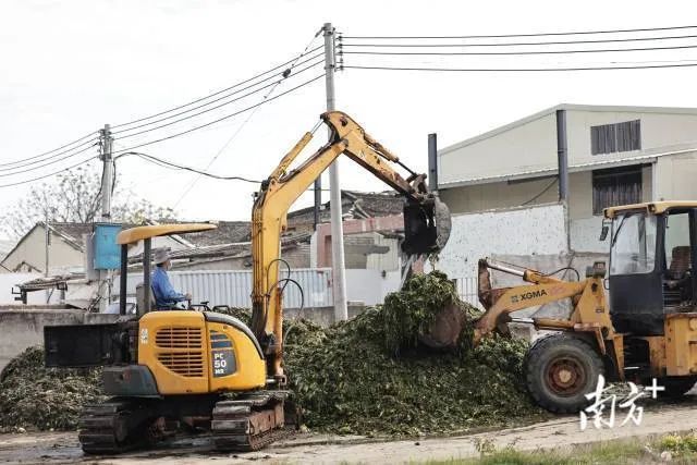 2月3日下午,两辆铲车出现在仓库门口,工作人员操作挖掘机将地上的芥菜搬运到仓库。