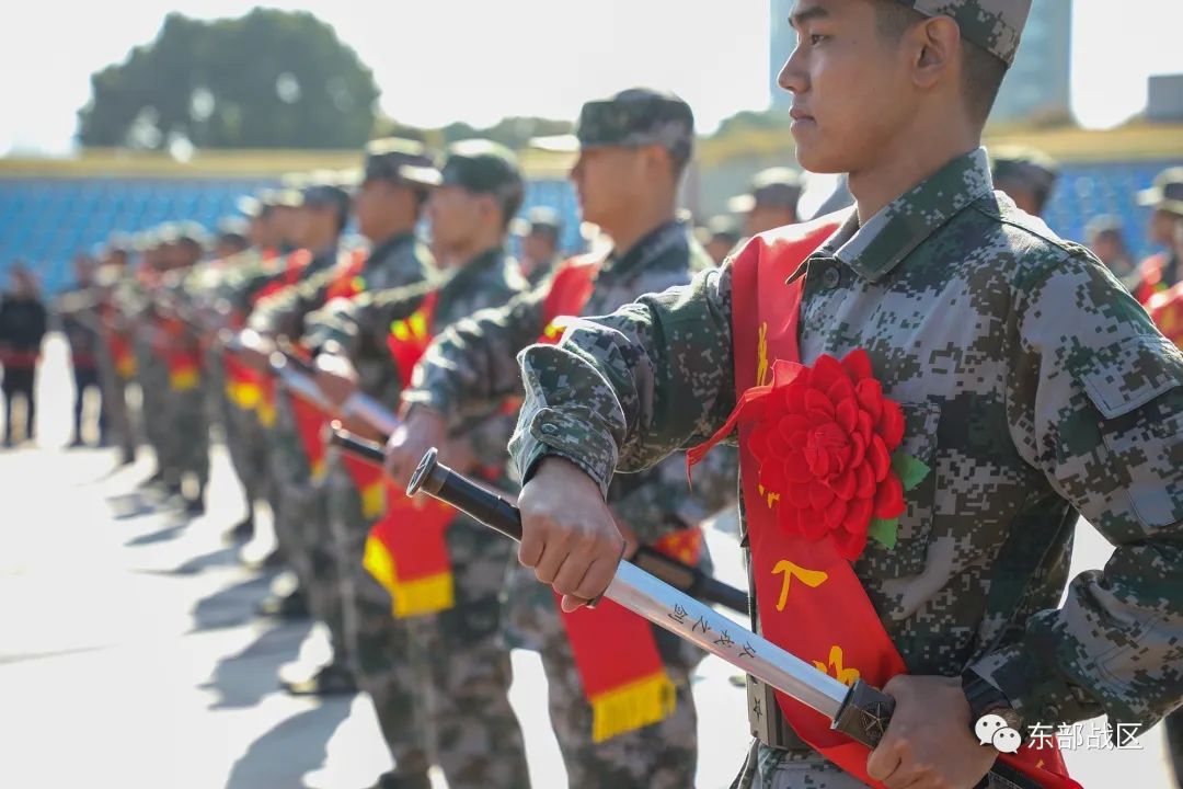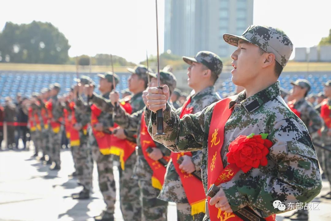 “从戎之剑—出鞘!”随着一声令下,80名新兵手持“从戎之剑”应声出鞘,锋芒乍现。