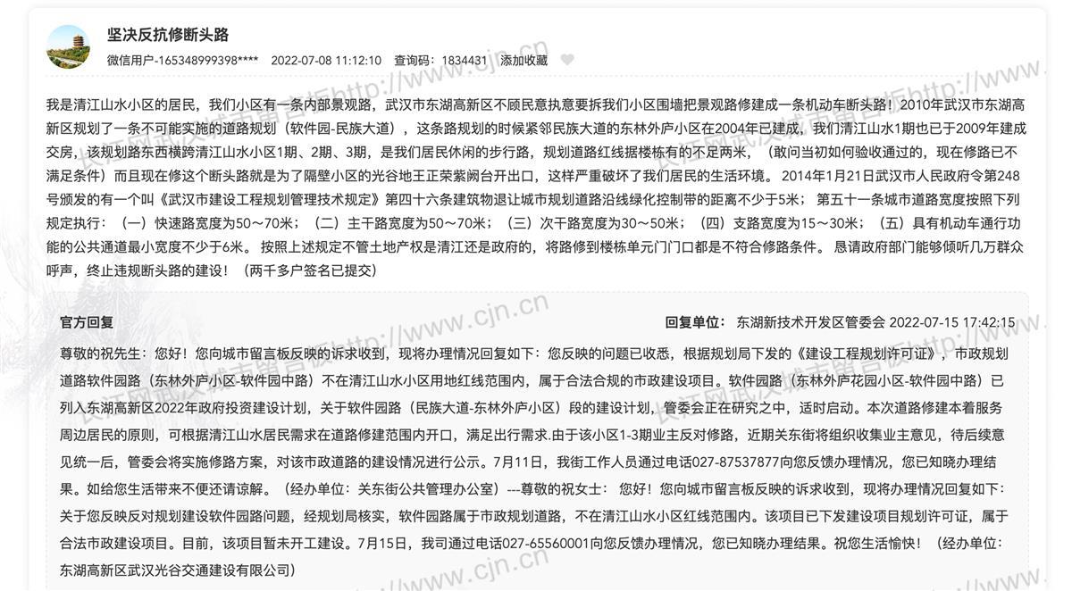武汉城市留言板清江山水业主反对修路的留言