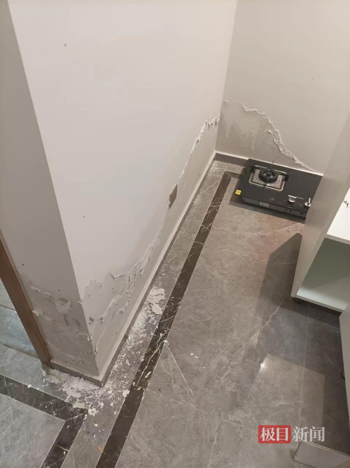 新房交付后没有进行装修,也没有搬进去入住用水用电,怎么可能漏水呢?在楼栋物业人员的引领下,马先生发现自家厨房外部的墙壁已被浸湿,或许是早已发生漏水情况,水渍一直蔓延至整个厨房、客厅,水渍痕迹的高度距离地面最高处接近半米,客厅的电视背景墙及餐厅的部分也遭到水渍浸湿。而在开发商维保部门工作人员检查发现,漏水点位于厨房角落墙壁内部的下水管道,由于施工时管道连接处存在接合问题,导致管道内水向外溢出,并逐渐渗透墙壁。