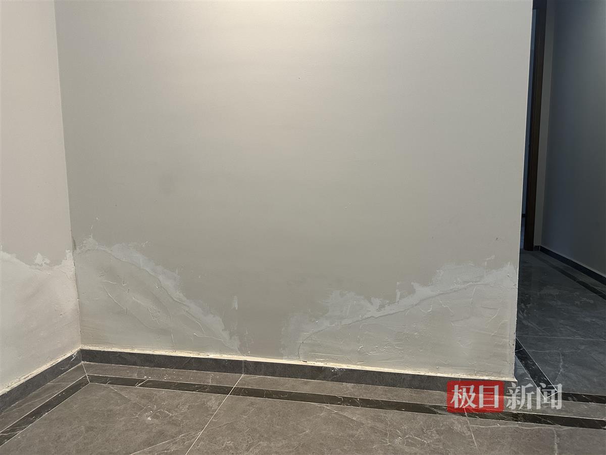2月28日,极目新闻记者来到金悦府小区,在马先生的家中,记者看到之前被水浸泡的墙面已经刷上了腻子,但还没有刷上墙漆,楼栋维保工作人员表示,这两天刚刚把马先生家被水泡过的地方修补好,等腻子干后,就可以刷漆了。通过痕迹,可以看出之前被泡的墙面高度确实有半米之高,而被浸泡的墙面几乎遍布了整个客厅。马先生告诉记者,因为担心后期刷漆的颜色和其他墙面形成色差,自己要求将整个客厅重新刷漆的要求也遭到了拒绝。“只补浸湿的部分油漆,肯定和之前的墙面漆颜色不一致,我希望他们能把整个客厅重新刷一遍,这个要求并不过分。”