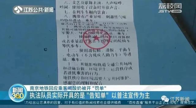 “3月14日的上午10:09左右,我办的执法队员正常开展列车巡查,当二号线列车到达羊山公园至学则路区间时,发现了一名女性乘客正在喝酸奶,执法队员随即上前进行劝阻,向乘客进行了《南京市轨道交通条例》相关内容的解读,随后开具了一张告知单,并非‘罚单’。”南京市地铁交通设施保护办公室综合行政执法一大队副大队长陈文才介绍。