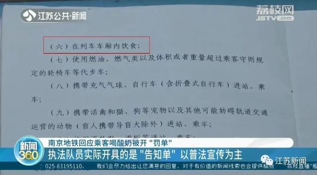 执法人员介绍,在此过程中,这名女乘客非常配合。《南京市轨道交通条例》于2014年7月1日正式实施,其中第38条第6款明确规定,禁止在列车车厢内饮食,执法人员开具告知单的主要目的是对乘客进行普法宣传,引导乘客自觉遵守文明乘车秩序。