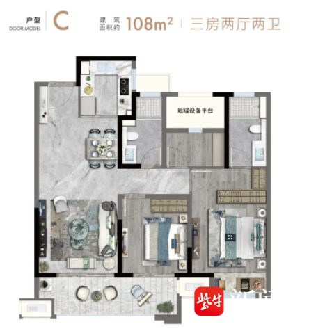 在售楼处提供的108平方米三房的户型图上,记者看到其北面的房间其实很小,基本与相邻的“地暖设备平台”差不多大。