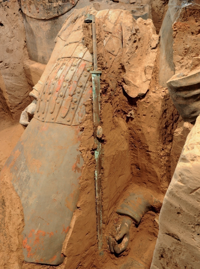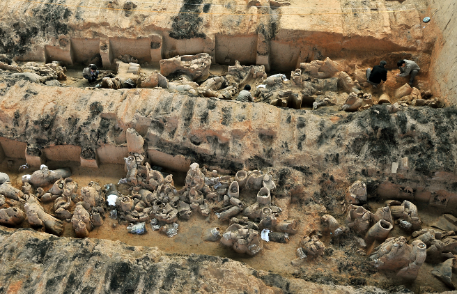 截至目前,这次发掘共清理出陶俑220余件、陶马16匹、战车4乘、鼓2处、鼓槌1处、漆盾1处、笼箙3处,发现车马器、兵器、生产工具等共计千余件组。