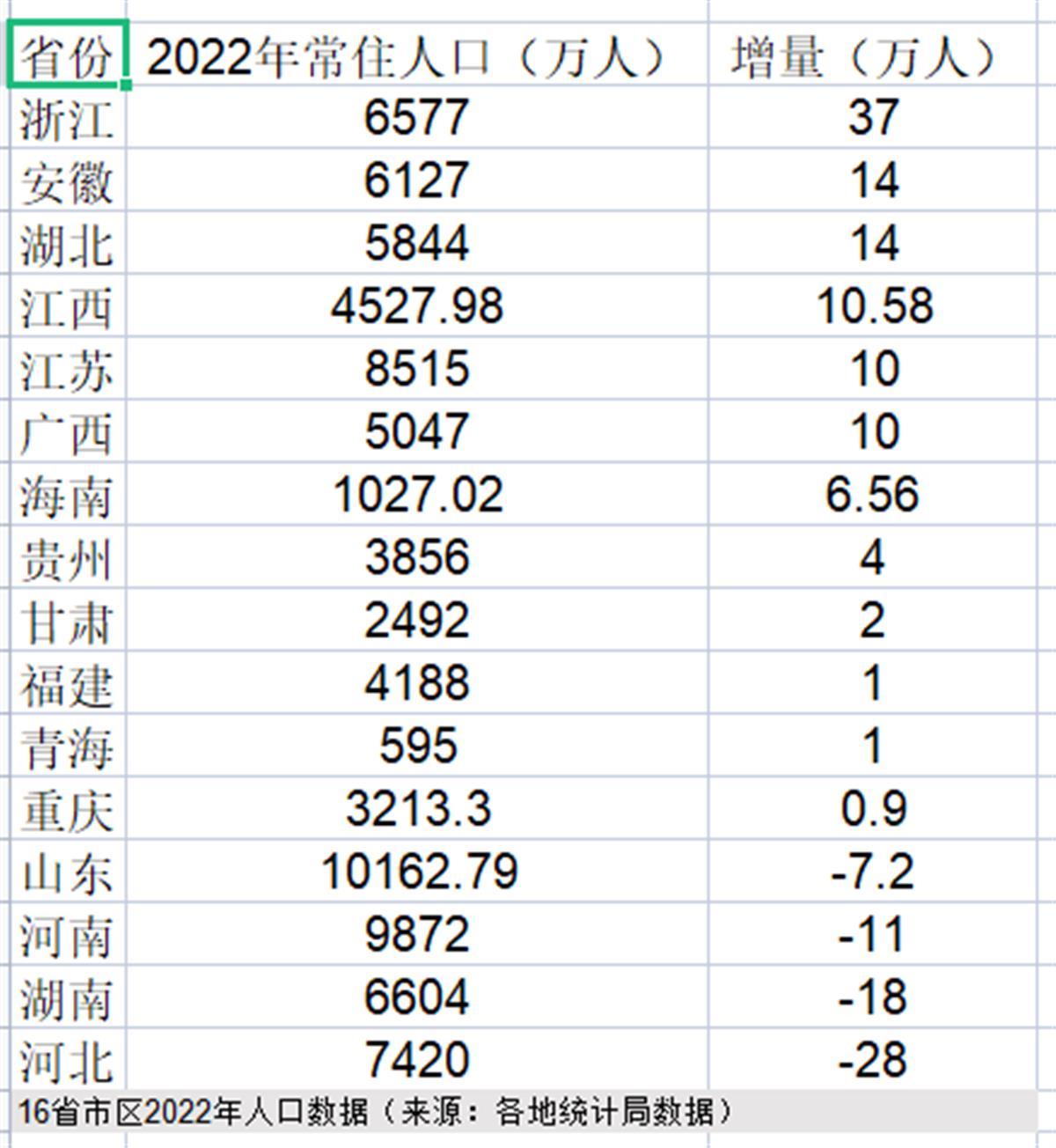 根据各地统计局数据,在已公布的16个省级行政区中,人口增量最大的为浙江,为37万人。其次,湖北与安徽一致,同为14万人。之后,江西增加10.58万人,江苏和广西同为增加10万人。另外,河北、湖南、河南、山东均为负增长。