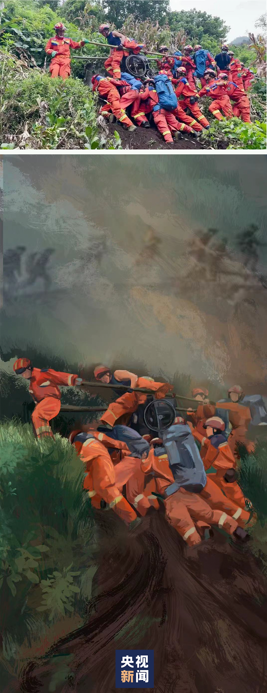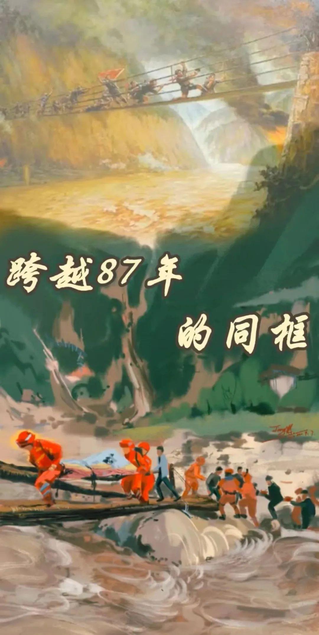 2022年泸定地震发生后,看到救援队员搭起简易木桥救援群众的画面,她深受触动,连夜创作出了《跨越87年的同框》,画面上方是“飞夺泸定桥”,下方是消防队员“飞架生命桥”。