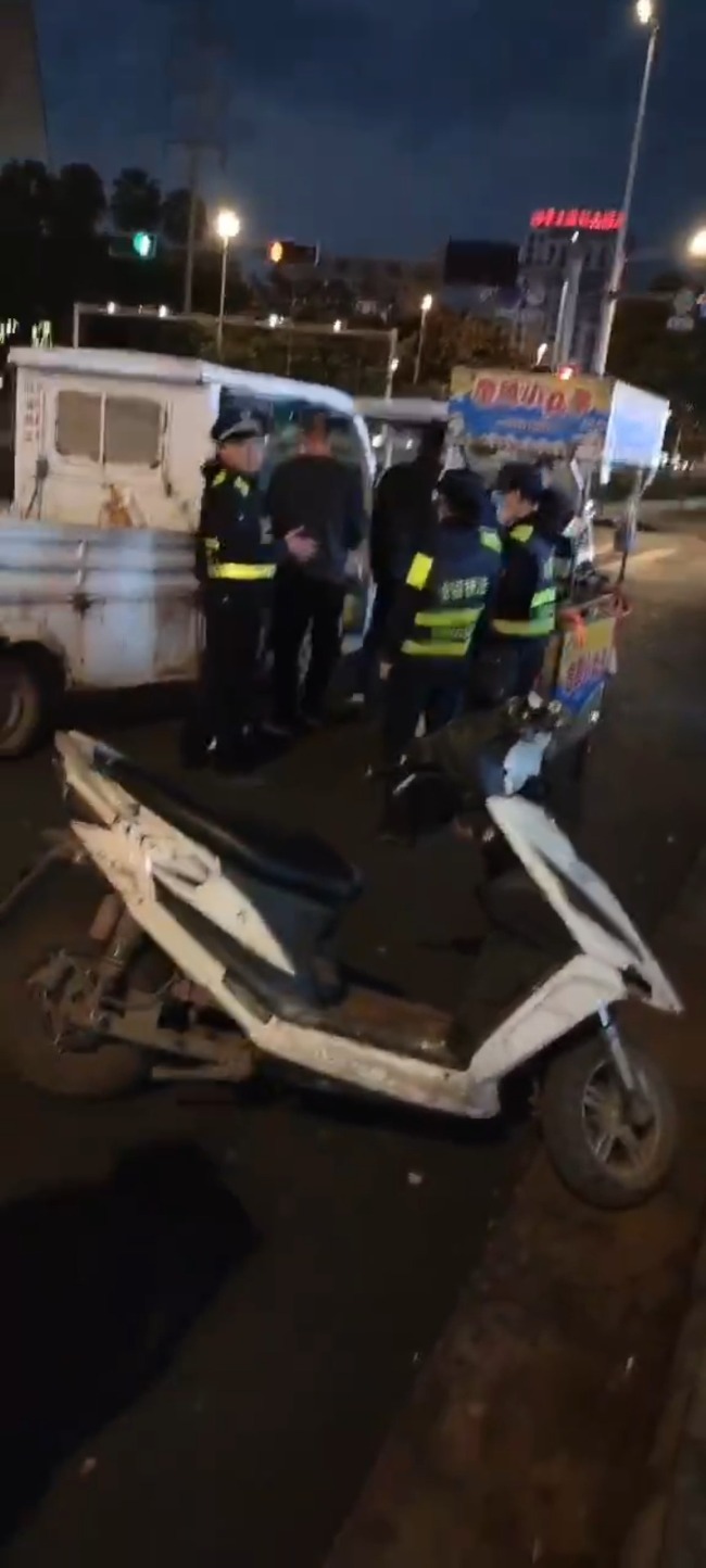何先生介绍,他是去年11月份来到南宁市西乡塘区苏卢北路、苏卢二路附近摆摊,平时和妻子一起,带着孩子在这里卖章鱼小丸子、烤肠。在这个路口有“禁止摆摊”的牌子,平常会遇到城管过来守着路口不让摆。3月16日晚6点40分左右,有城管车前来,附近摊贩见状就走了,何先生也走了,“其他人是开三轮车,我是手推车,相对慢一点。城管就开着车追过来。”
