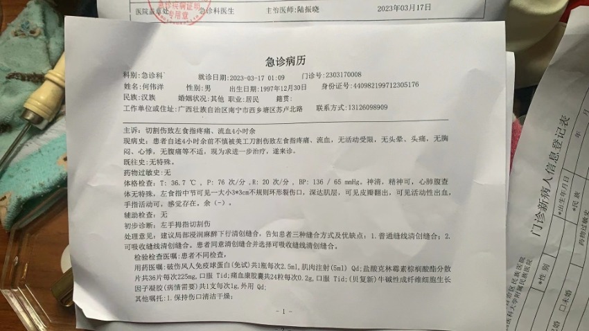 从何先生提供的急诊病例单上,能看到何先生左食指切割伤。