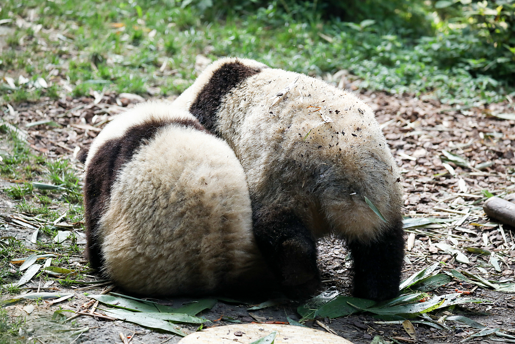 2022年7月4日,成都大熊猫繁育研究基地,当时大熊猫和花(左)、和叶(右)迎来它们两岁生日。视觉中国图