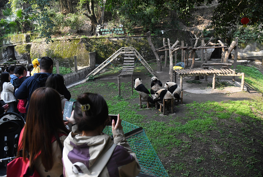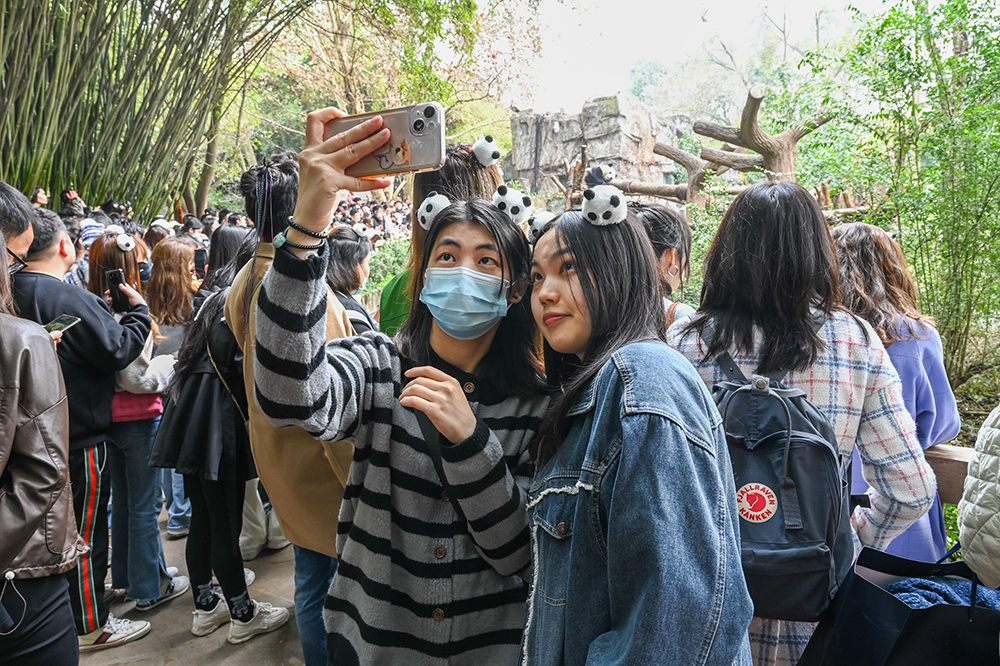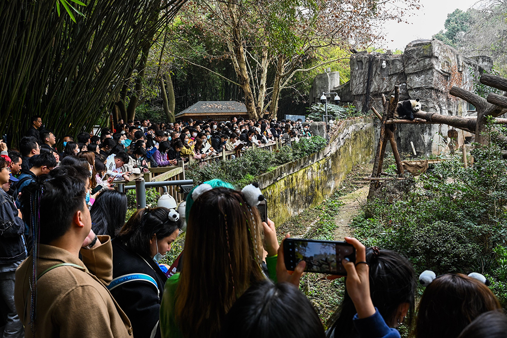 2023年3月7日,四川成都,成都大熊猫繁育研究基地,大批市民游客前来一睹熊猫和花萌态。成都商报-IC图