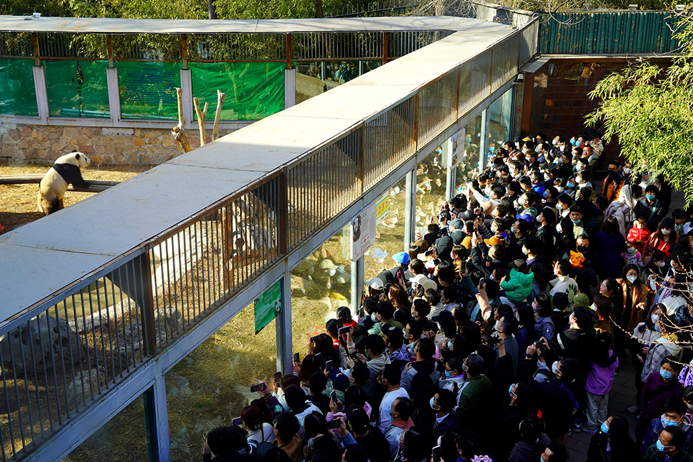 2023年3月12日,北京动物园大熊猫馆内人头攒动,萌兰的兽舍前围了上百名游客。IC图图