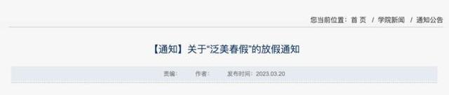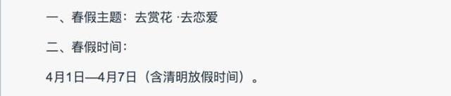3月20日,四川西南航空职业学院官网发布了《关于“泛美春假”的放假通知》,通知安排全校师生4月1日至7日放7天春假(含清明放假时间)。