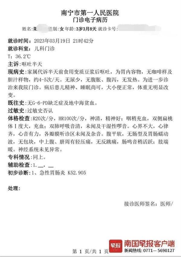 3月19日下午,阳先生在南宁市七星路梁记叉烧包店购买豆浆和叉烧包给3岁的女儿食用,吃到一半发现豆浆呈豆腐花状。当天傍晚,孩子多次呕吐,被诊断为急性胃肠炎,要住院治疗。