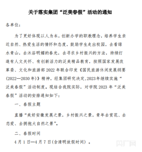 央广网宿州3月24日消息(记者徐秋韵)3月23日,宿州航空职业学院发布放假通知,全校师生4月1日至7日放7天春假(含清明放假时间)。