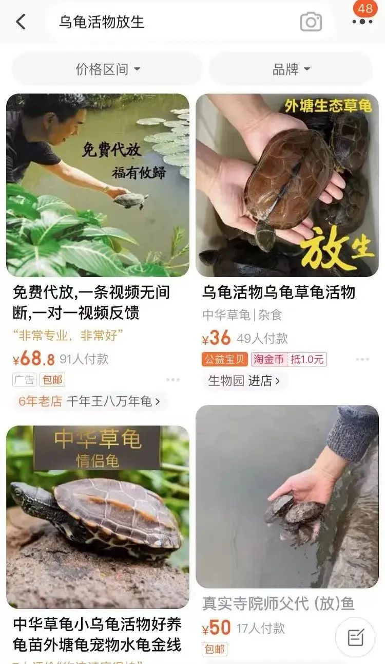 据南方周末,记者在淘宝搜索“放生”会自动跳转到“绿网计划”页面,提示非法放生和遗弃将承担法律责任。但是只需在“放生”后面加上具体放生的物种就可以轻松找到卖家,例如“放生鱼”“放生活鱼”“放生乌龟”等。