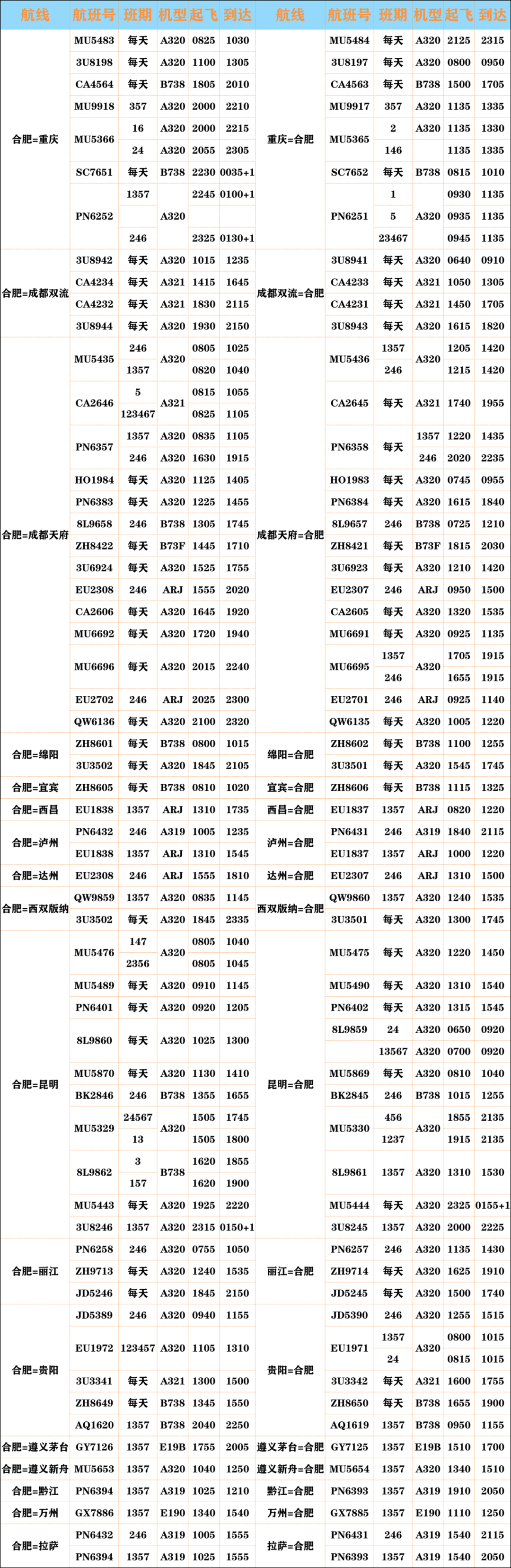 *合肥=西双版纳3U3502/3U3501经停绵阳
