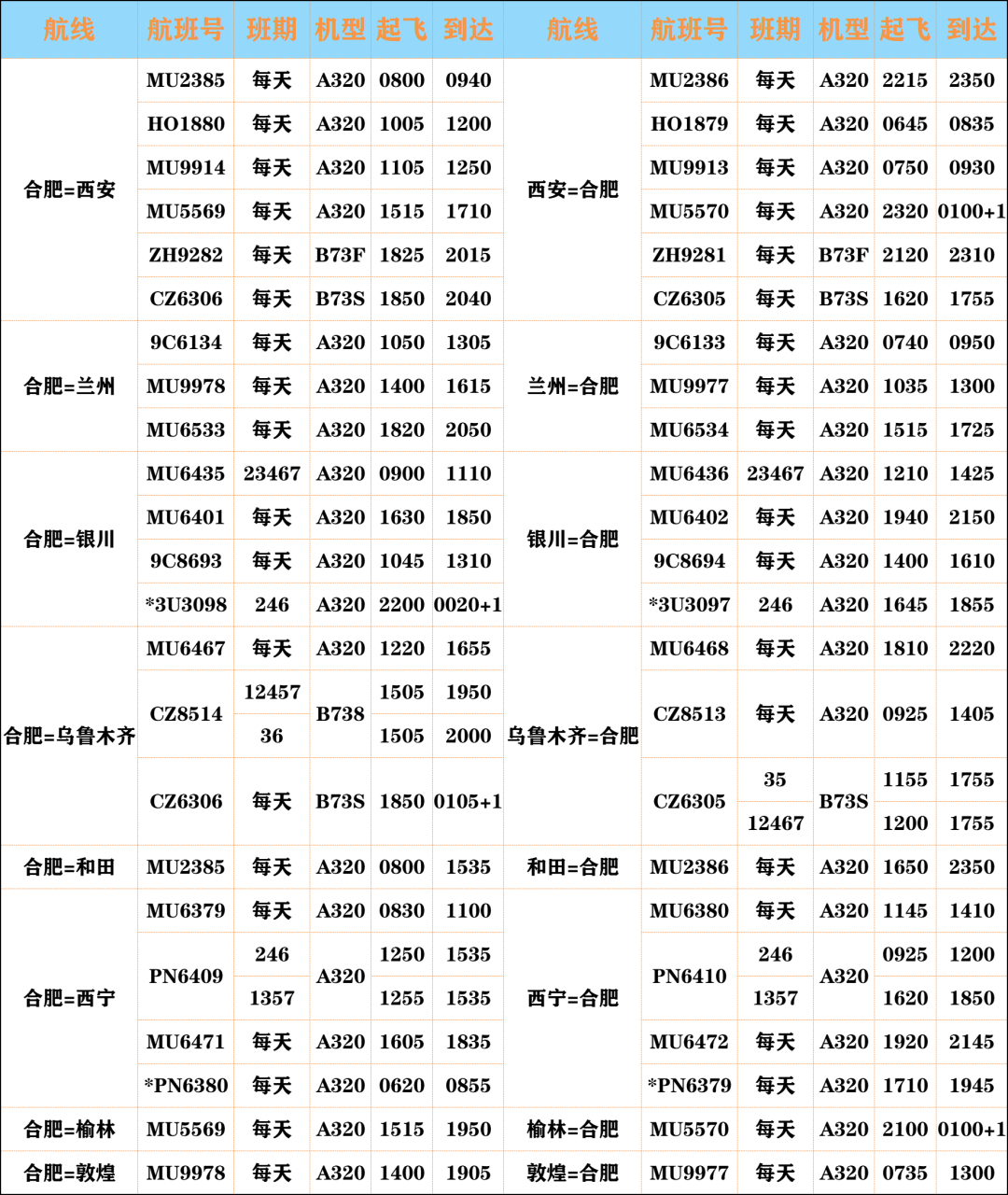*合肥=敦煌 MU9978/MU9977经停兰州
