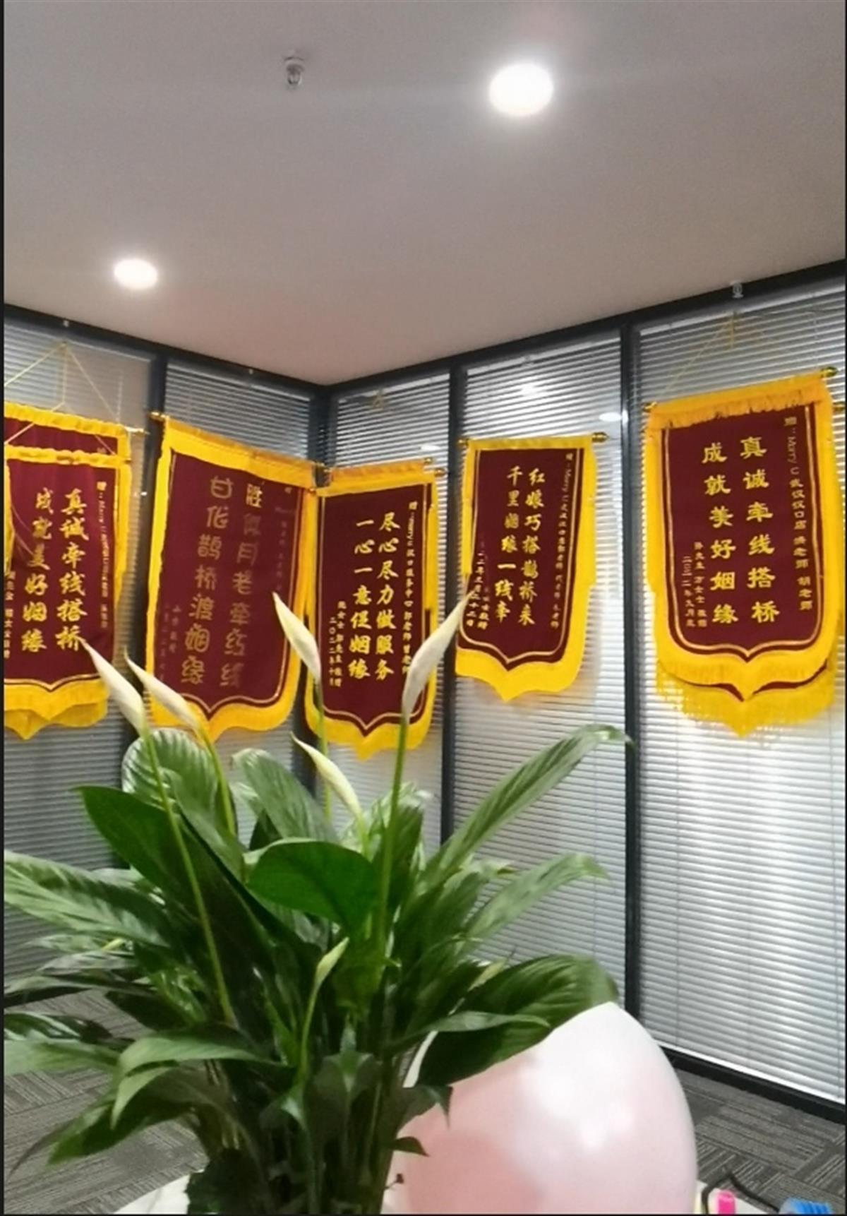 当年6月中旬,华女士来到江汉区金家墩特1号天街5栋16楼1616室。见公司客厅的墙壁上,挂有许多客户牵手成功后赠送的锦旗,她的心中充满了相亲成功的希望。