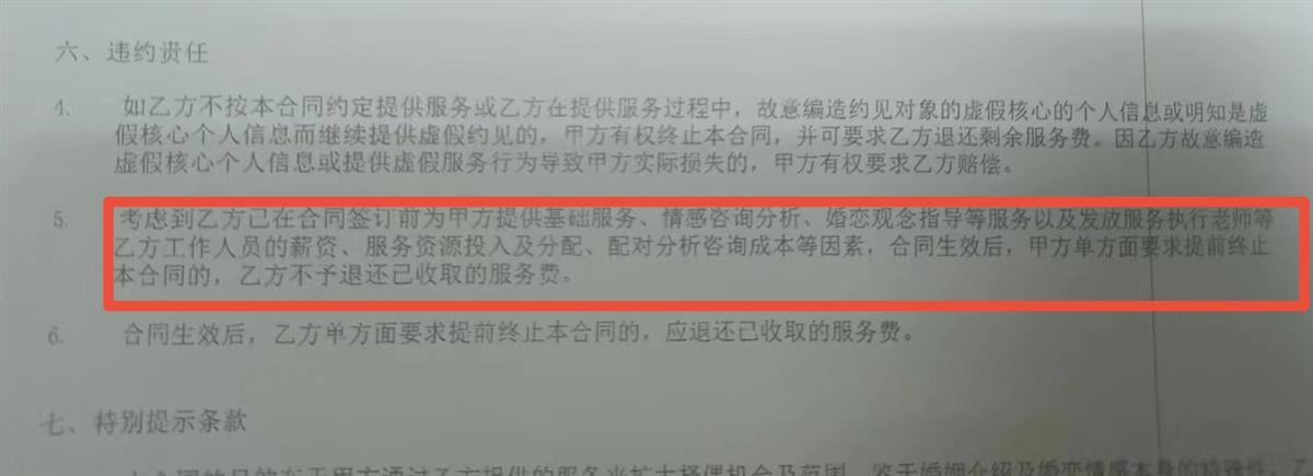 3月1日上午,阮经理带来了合同。华女士说,合同上有“半年内介绍4个相亲对象”即完成服务,还有“双方同意本合同金额的30%为提供婚姻介绍服务的基础费”等内容。