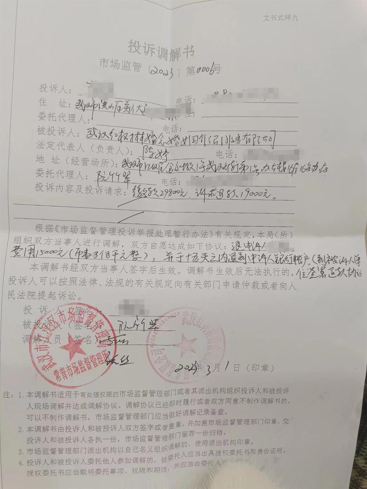 因为工作和家事繁忙,在做通父母工作后,华女士自己也不想再麻烦工商所组织第二次调解,3月8日上午,她到公司找到阮经理,按照之前退1.5万元的调解意见,签订了退款协议。