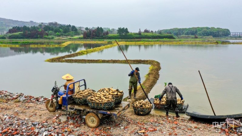 板桥镇莲藕种植基地,藕农在田间转运莲藕(央广网发周秀鱼春摄)