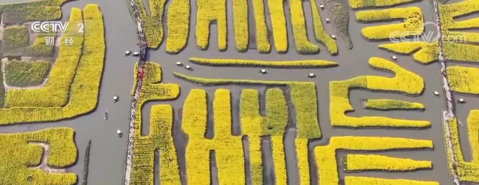 总台记者吴睿:我现在的位置是在江苏省兴化市千垛镇。远处,近处,那一片片金黄色的垛田如同一块块被切开的蛋糕,漂浮在纵横的水道之上,这就是全国独一份的“水上花海”奇景。