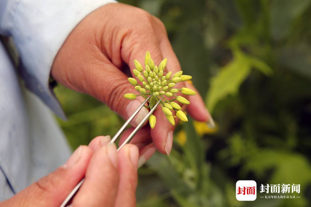 “杂交的目的就是优良基因的聚合……”李云挑选了一株油菜,用镊子熟练地去掉已开的花朵和最顶端的幼蕾,把明天即将要开的花蕾剥开、摘掉雄蕊,再授上其他材料的花粉,挂好标签,最后套上袋子,以防止外源花粉的污染。