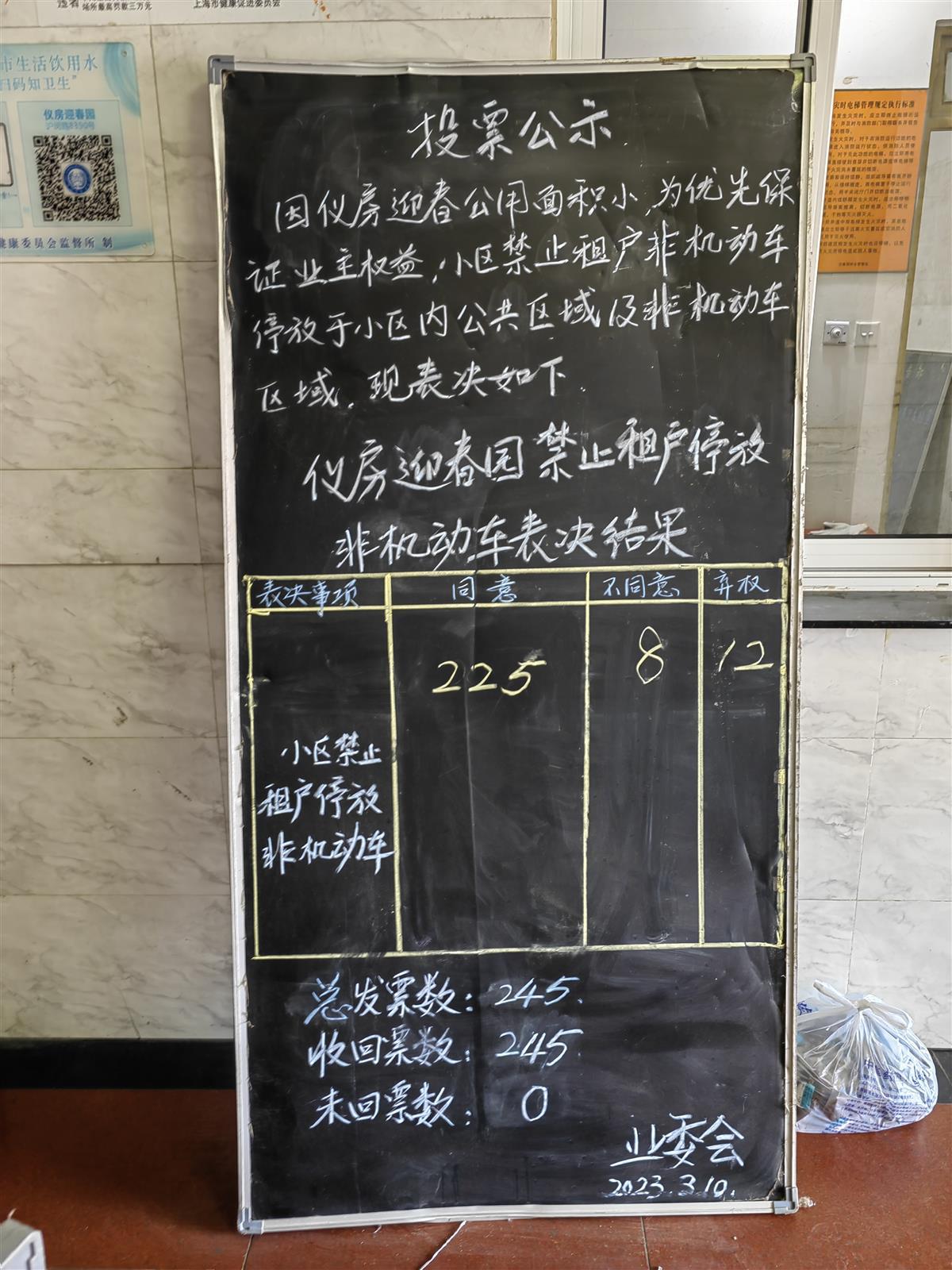 小区一楼大厅摆放的投票公示称,因仪房迎春园公用面积小,为优先保证业主权益,小区禁止租户将非机动车停放于小区内公共区域及非机动车区域。附带的表决结果显示,总收回票数245张,其中225票同意,8票不同意,12票弃权。