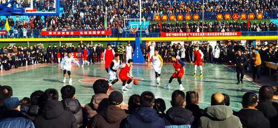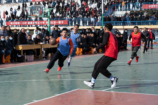 2月14日,宁夏回族自治区固原市西吉县篮球公园,“中国体育彩票杯”宁夏西吉县第六届农民篮球争霸赛宁南宁北明星对抗赛比赛现场。图片由宁夏西吉县体育中心提供
